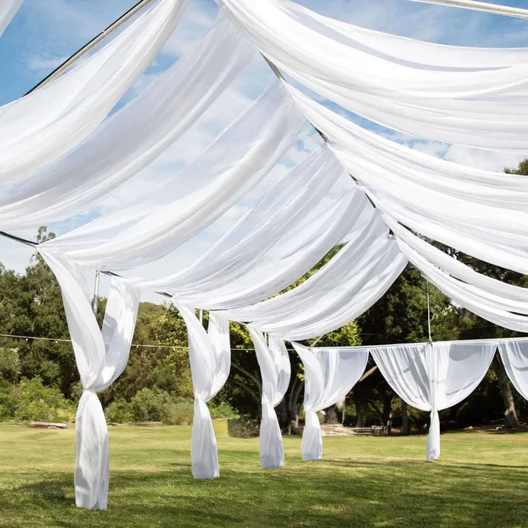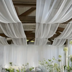 Elevate your event with the timeless elegance of white. Whether you're draping a 100' tree or covering an entire ceiling, we offer customizable solutions to fit any occasion. Our Flame Retardant Sheer Fabric Roll White (118" wide) brings a touch of pristine style and sophistication, perfect for creating that magical ambiance. Clean, luxurious, and versatile, this fabric is ideal for any event, large or small.